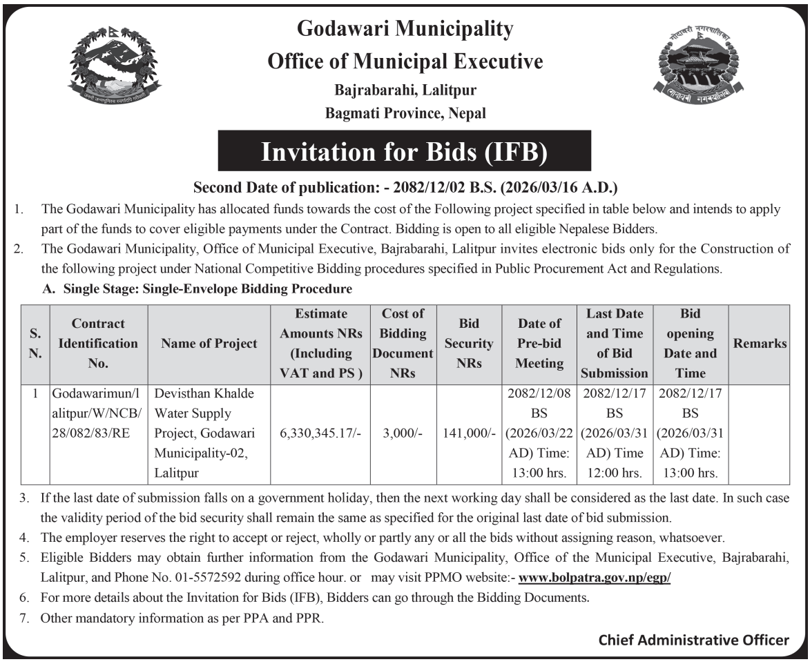 | 85 | Water Supply & Sanitation Division Office, Baitadi | Construction of 200mm thick RCC walled Circular Sumpwell Structure, GI Pipe Laying Jointing and Water Related Construction work for Batulasau Water Supply Project, Patan Municipality-01, Baitadi. | 15/03/2026 | PPMO | 15/04/2026 | Click Here | |