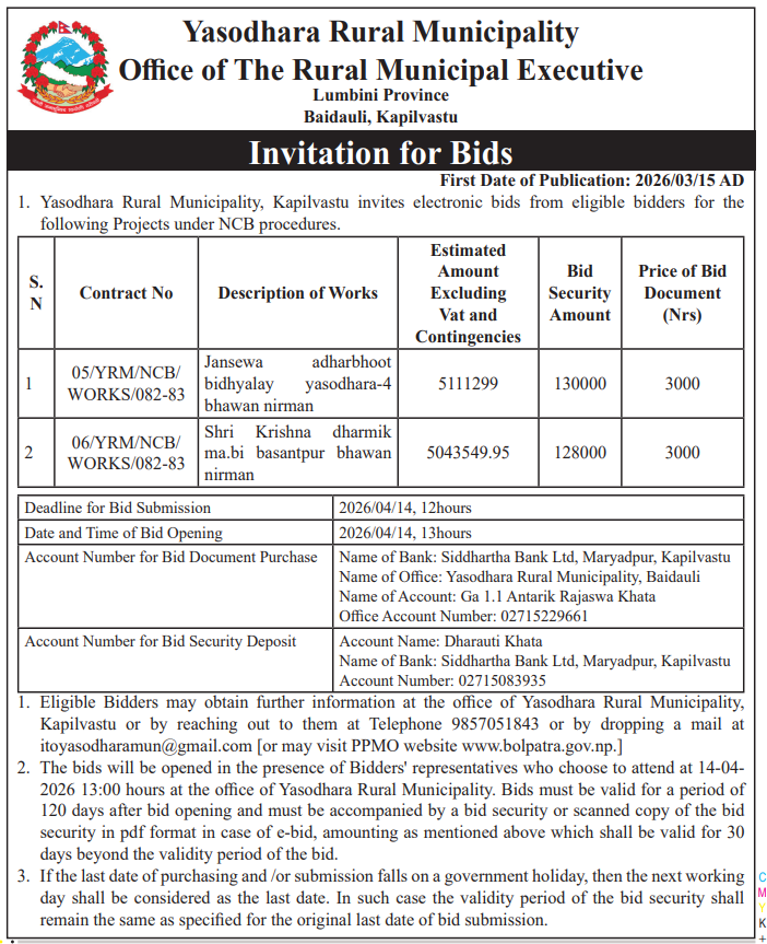 | 128 | Yasodhara Rural Municipality, Kapilvastu | Jansewa aadharbhoot bidhyalay yasodhara-4 bhawan nirman | 15/03/2026 | PPMO | 14/04/2026 | Click Here | |