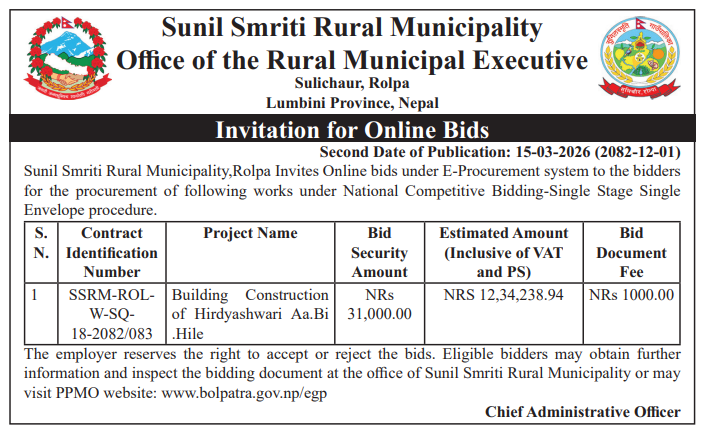 | 5 | Sunil Smriti Rural Municipality, Office of Rural Municipal Executive,Sulichaur, Rolpa | Building Construction of Hirdyashwari Aa.Bi.Hile | 15/03/2026 | PPMO | 30/03/2026 | Click Here | |