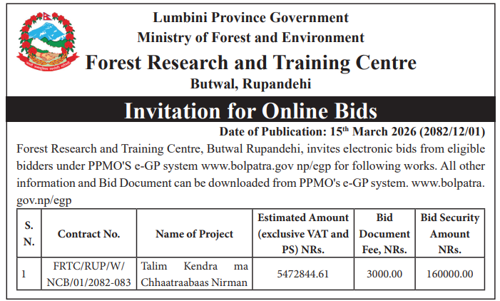 | 130 | Forest Research and Training Center, Butwal | Construction of Hostel Building | 15/03/2026 | PPMO | 14/04/2026 | Click Here | |