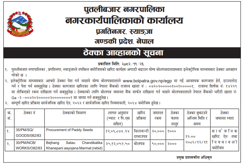 | 133 | Annapurna Rural municipality, Kaski | Construction/Upgrading of Prembasti Rural Road | 15/03/2026 | PPMO | 13/04/2026 | Click Here | |