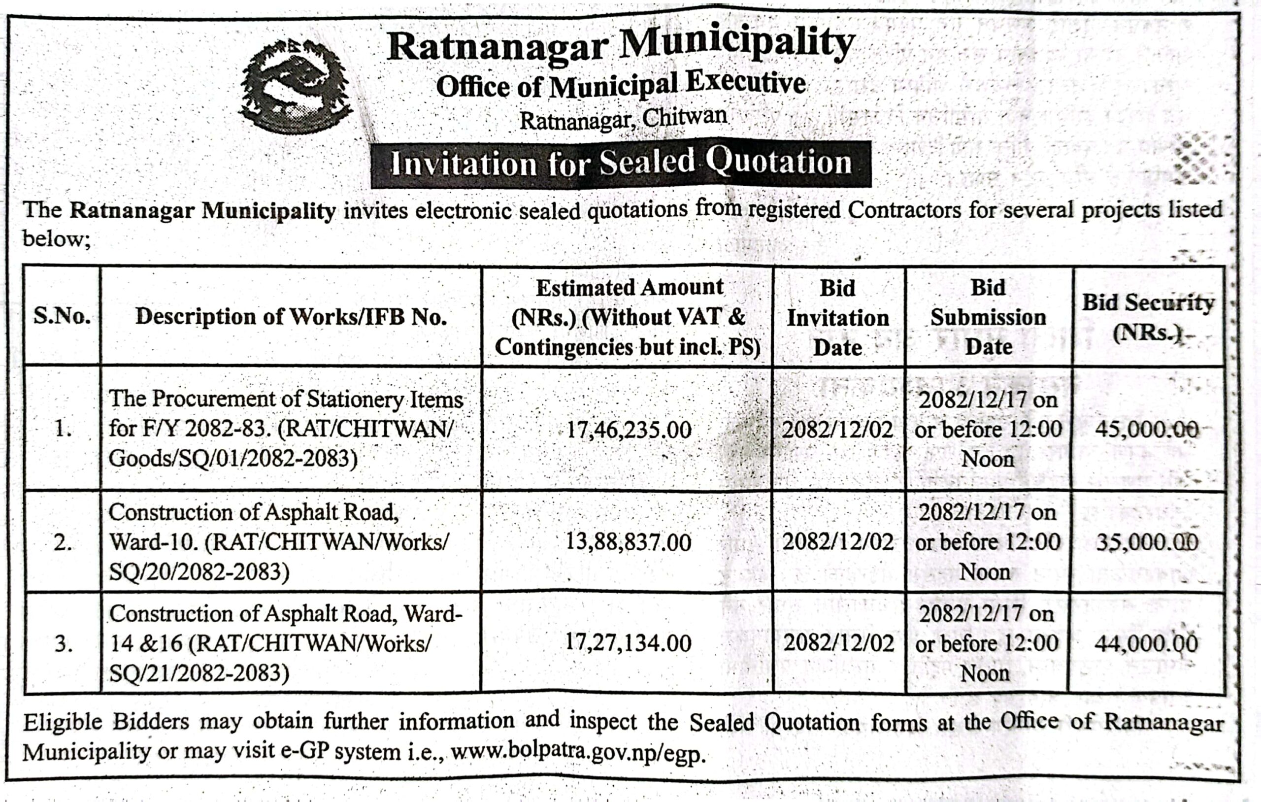 | 119 | Ratnanagar Municipality Office, Bagmati Province, CHITWAN; | Construction of Asphalt Road, Ward- 6 & 7 | 15/03/2026 | PPMO | 15/04/2026 | Click Here | |