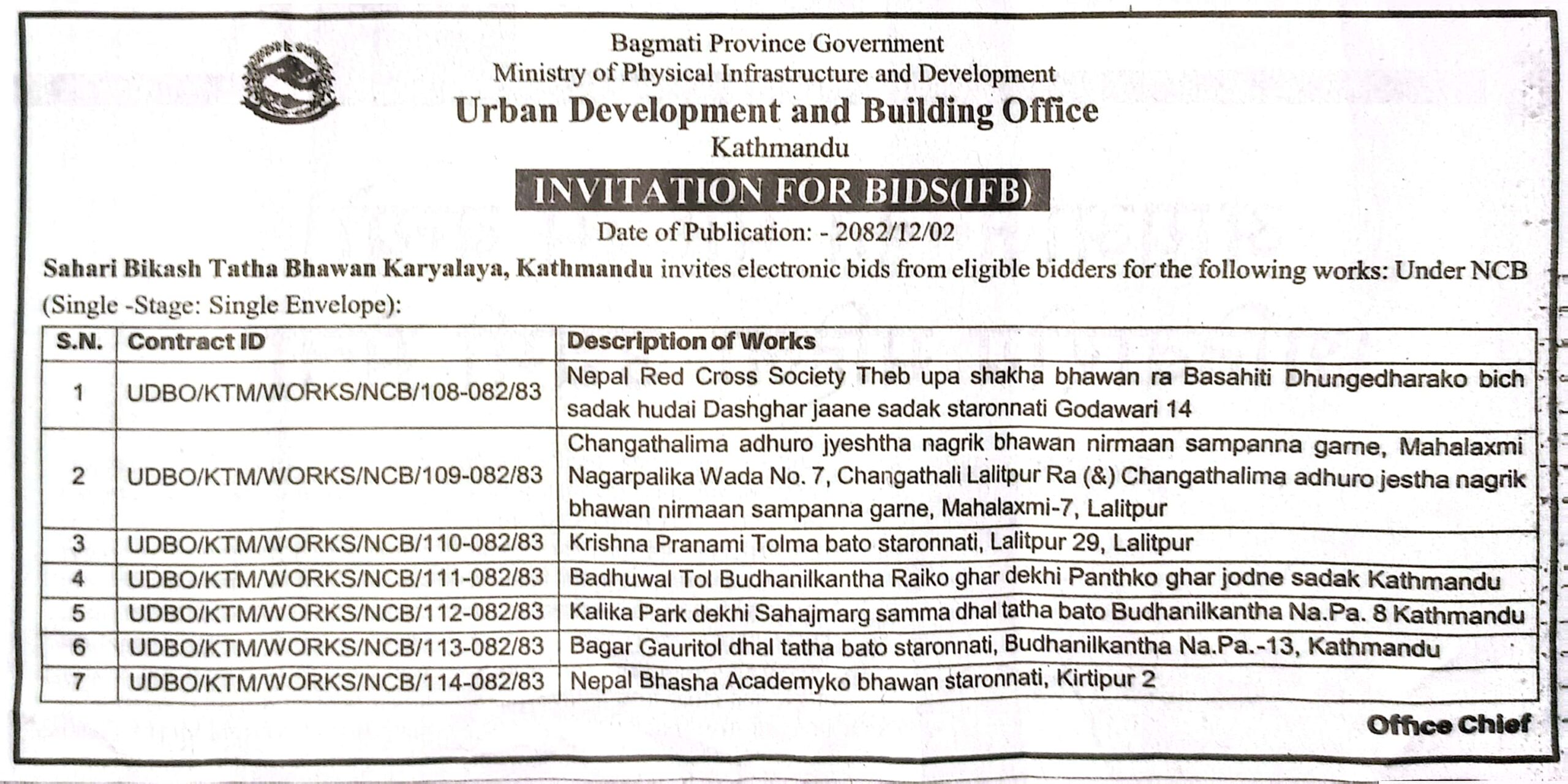 | 19 | DUDBC,FPIU,KASKI | Reconstruction of the CDO Office Building and Quarter damaged during the Gen-Z Protest at Damauli, Tanahun | 15/03/2026 | PPMO | 22/03/2026 | Click Here | |