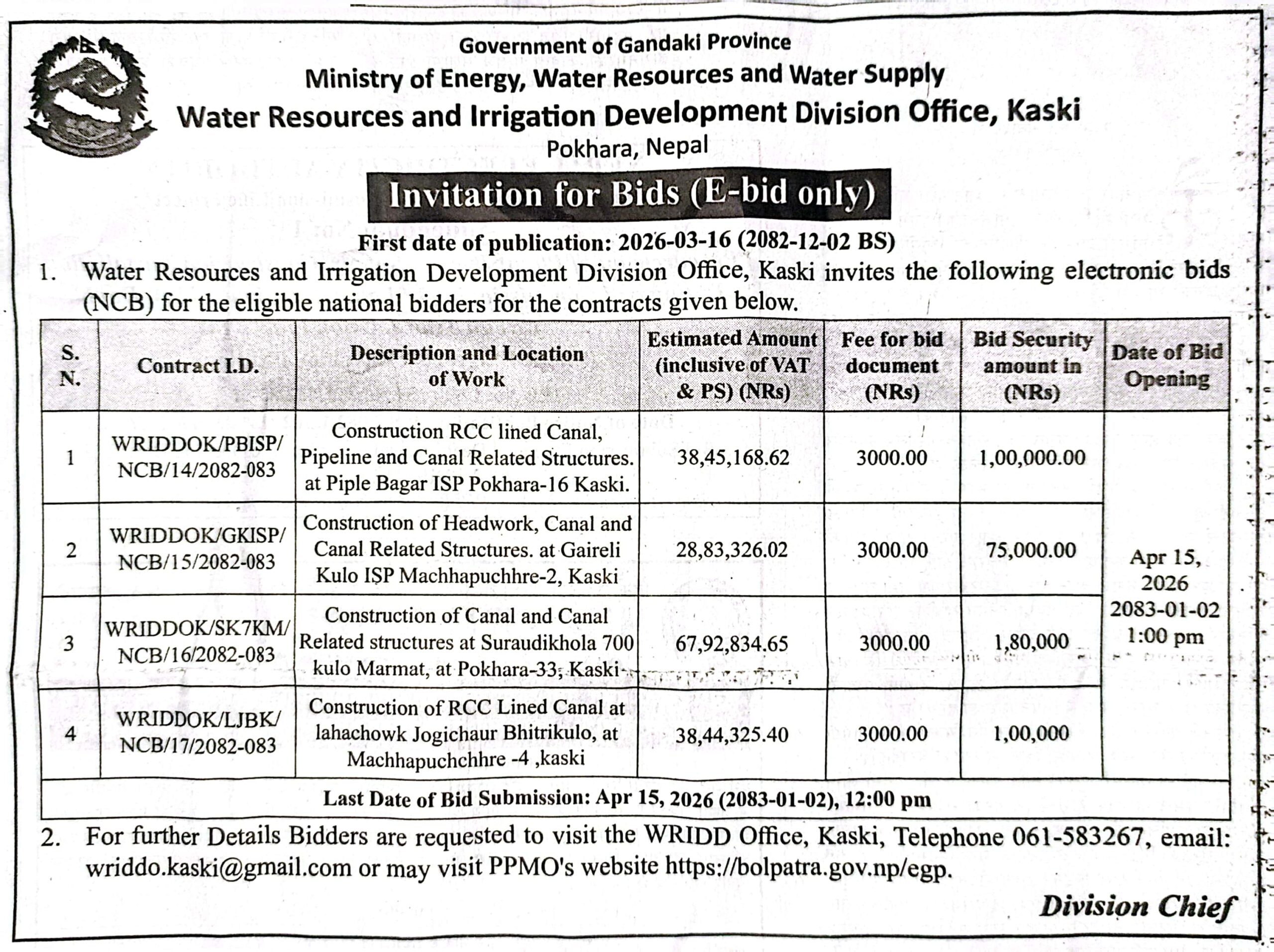 | 71 | Nepal Water Supply Corporation, Pokhara Branch | 500mm and 400mm dia. D.I pipe protection works at Kaduri Bridge and other place from mardi to Yamdi. | 15/03/2026 | PPMO | 16/04/2026 | Click Here | |
