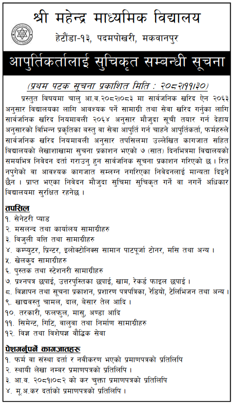 | 53 | Naraharinatha Rural Muinicipality | Medicine & Drugs Procurement of Basic Health & Sanitation Branch. | 15/03/2026 | PPMO | 30/03/2026 | Click Here | |