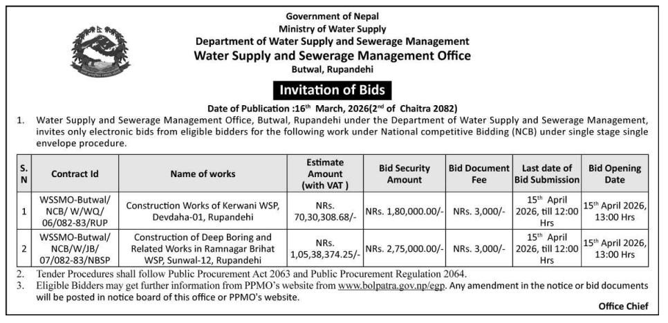 | 17 | Urban Development and Building Office, Rupandehi | Mahuwa Jitendra Kurmi House To Nahar P.C.C Road Works, Kapilvastu-04, Kapilvastu. | 15/03/2026 | PPMO | 30/03/2026 | Click Here | |