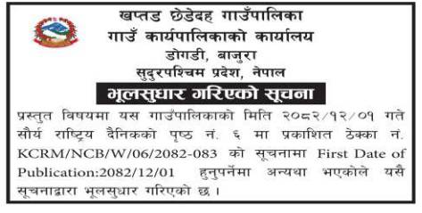 | 96 | Khaptad Chhededaha Rural Municipality, Bajura | Construction of Jiulekh Basic School Building work (2-Room, Single Storey)at KCRM -04, Bajura | 15/03/2026 | PPMO | 15/04/2026 | Click Here | |
