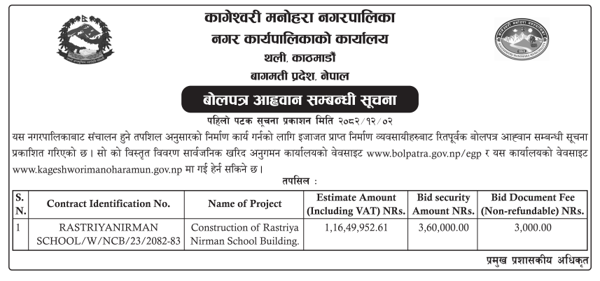 | 113 | Paroha Municipality Office, Madhesh Province, RAUTAHAT; | Construction of 4-Room School Building of Anhotilal Secondary School Basabtpattee, Paroha-6, Rautahat | 15/03/2026 | PPMO | 15/04/2026 | Click Here | |