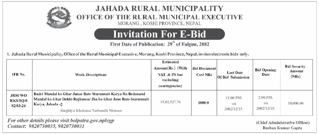 | 114 | Paroha Municipality Office, Madhesh Province, RAUTAHAT; | Construction of Blacktop Road of Padam Sadak-Laukaha-Pokhariya-Jingdwa Road | 15/03/2026 | PPMO | 15/04/2026 | Click Here | |