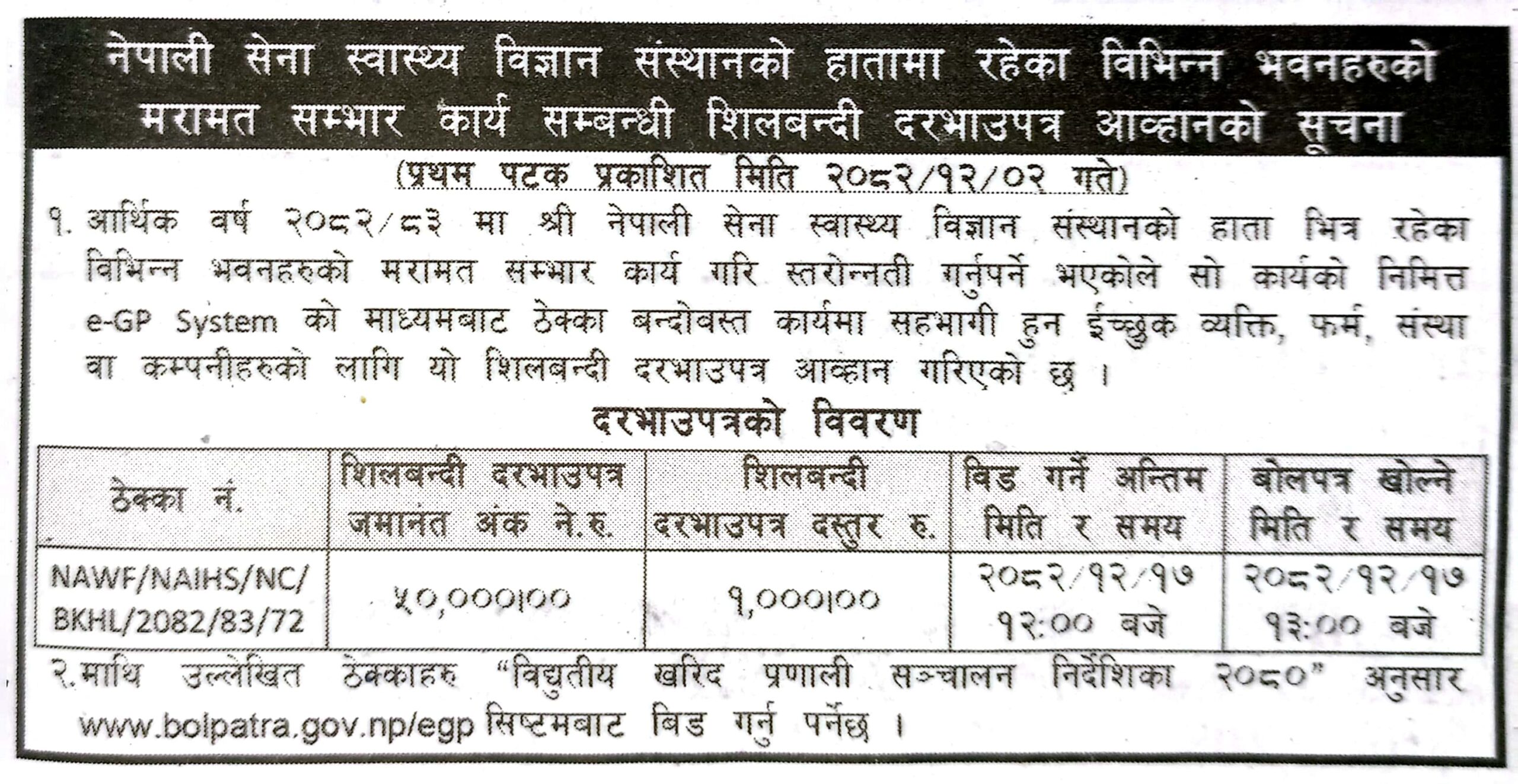 | 3 | Project Office of Urban Development and Building Construction, SAPTARI | Maintenance of Food Management and Trading Company Limited Building Office,Lahan Siraha | 15/03/2026 | PPMO | 30/03/2026 | Click Here | |