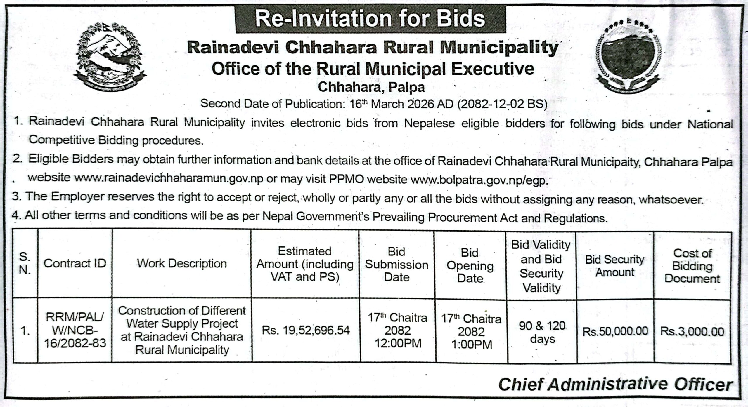 | 83 | Naubahini Rural Municipality Office, Lumbini Province, PYUTHAN; | Simsar Water Supply Project, Ward no. 6 | 15/03/2026 | PPMO | 15/04/2026 | Click Here | |