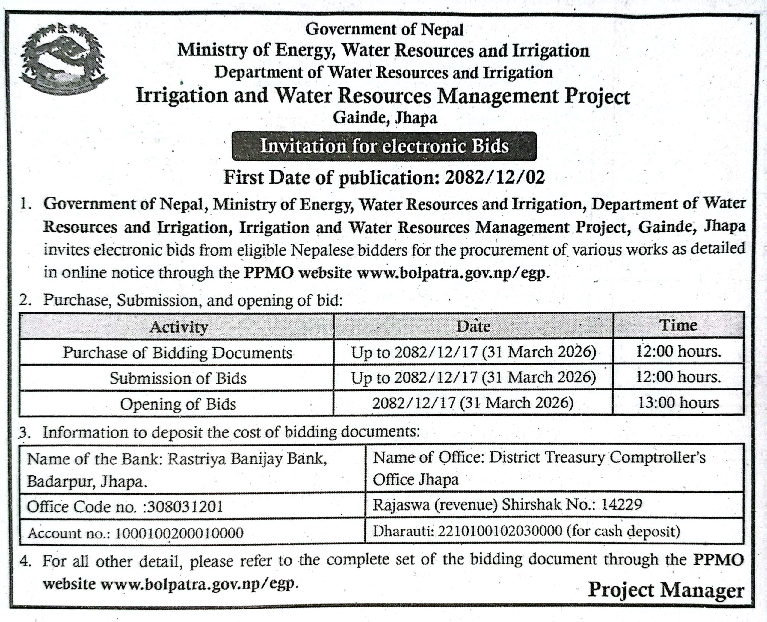 | 154 | NEA, Rangeli Distribution Center | Ht/Lt line maintenance works | 15/03/2026 | PPMO | 30/03/2026 | Click Here | |