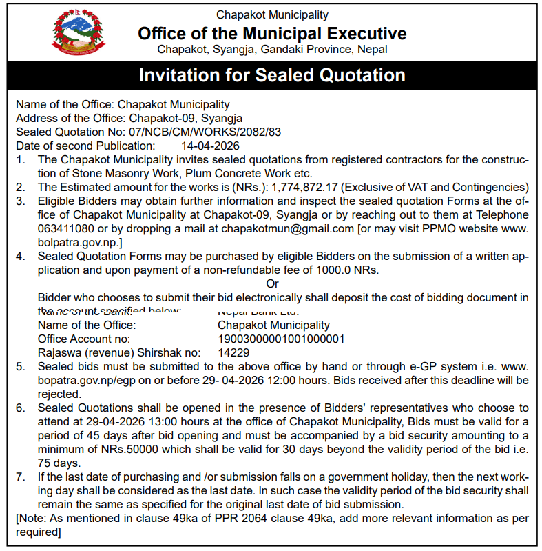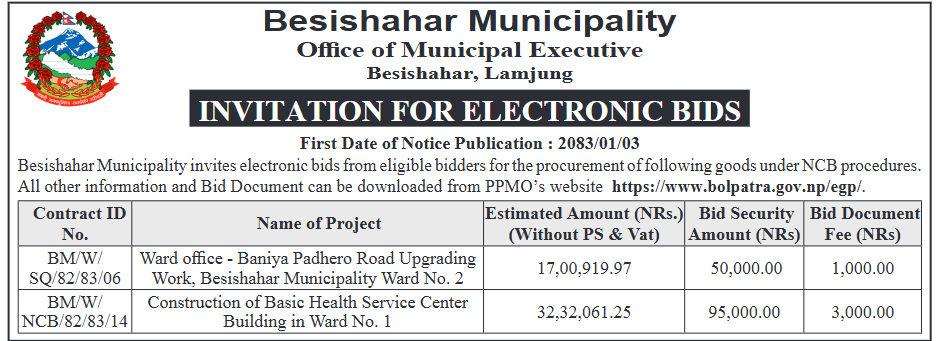 | 61 | Palungtar Municipality | Sustainable Collection & Extraction of River Bed Materials from Bhandari phat Ghaat ( Chepe Nadi),Palungtar-03,Gorkha | 15/04/2026 | PPMO | 30/04/2026 | Click Here | |