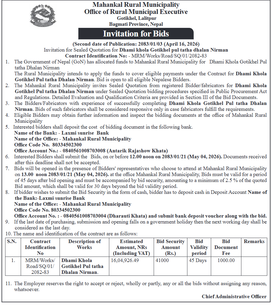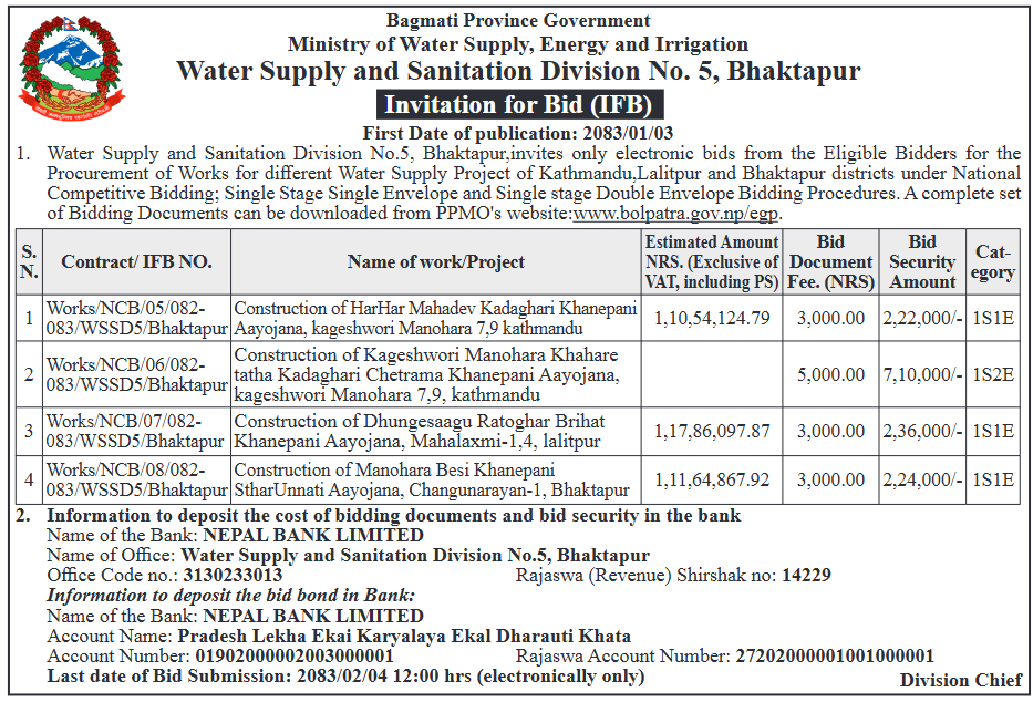 | 35 | Water Resources and Irrigation Development Division Office Baglung | Construction of Intake, Irrigation Canal and Associated Structures at Khaharekhola Joibagar ISP & ThuloKulo Khaharekhola Rikhetari ISP in Badigad Ga.Pa-5, Baglung | 15/04/2026 | PPMO | 15/05/2026 | Click Here | |