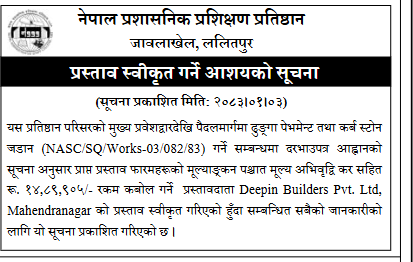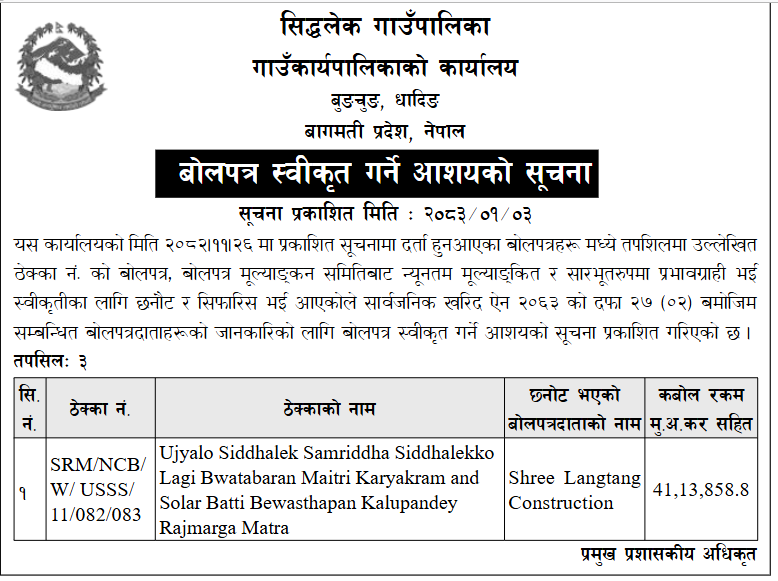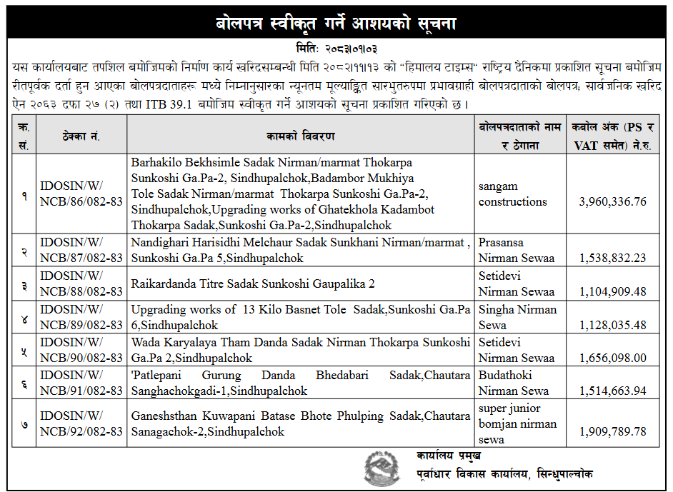 - Award Notice : Road Upgrading Work At Various Places (Swornikita Construction and Suppliers, Gatishil-Gravity JV) |