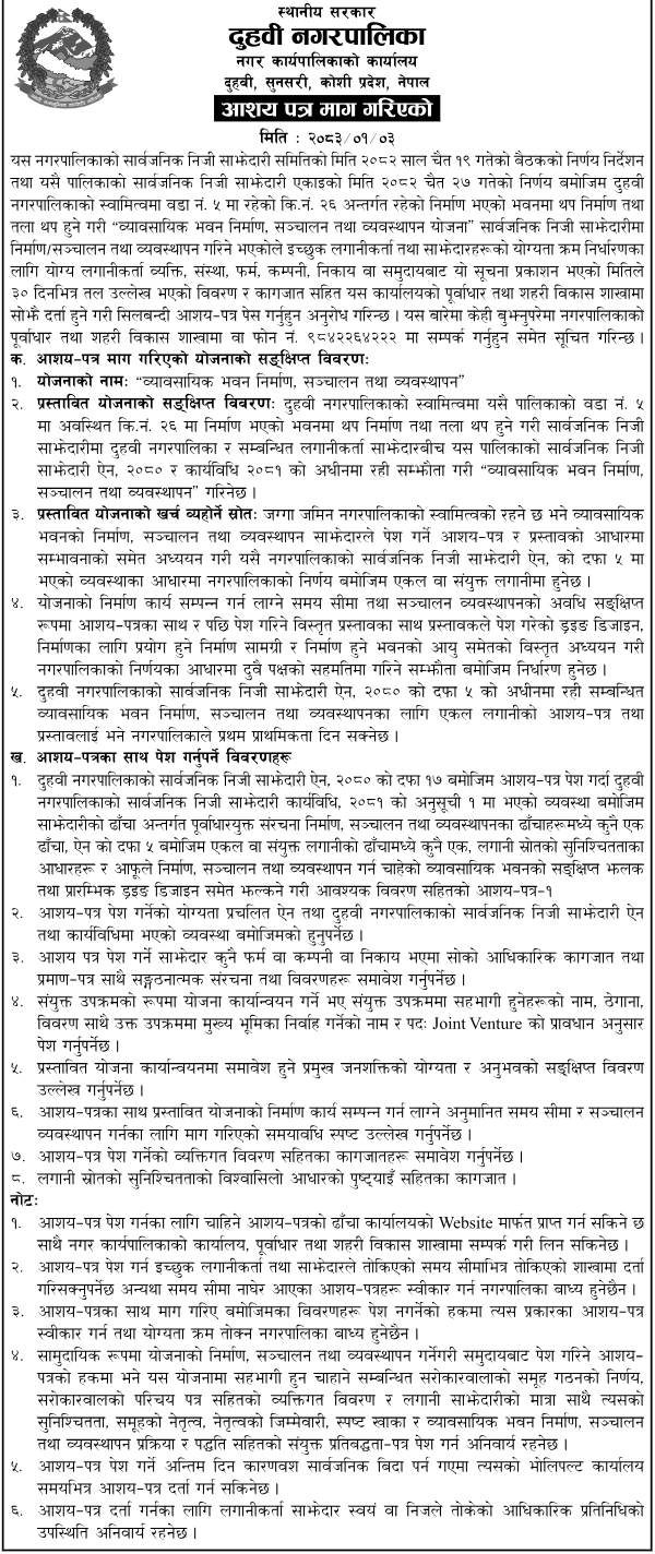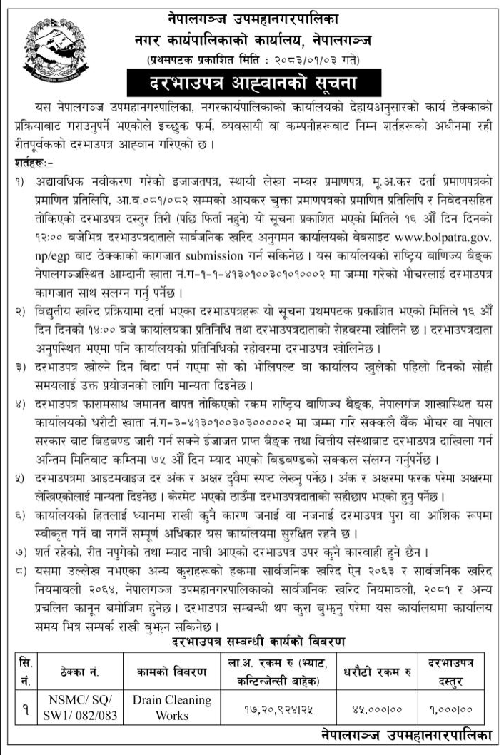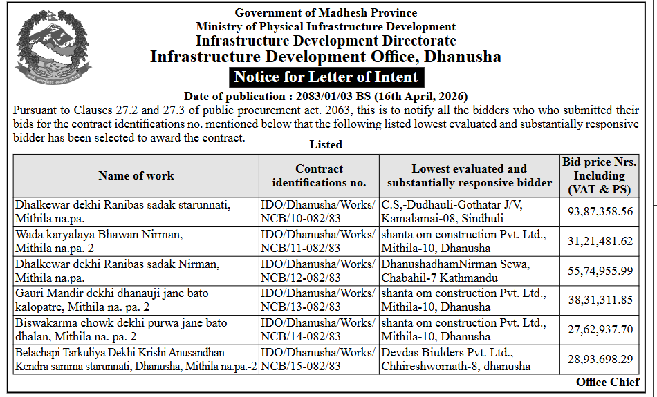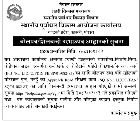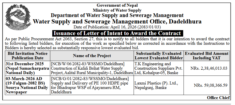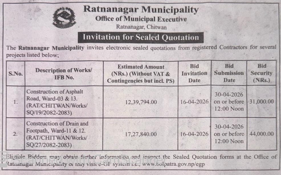 | 17 | Urban Development And Building Office, Kailali | Bela Road Dhekhi Paschim Chet Khadka Jamin Jodne Bato Pakki Nala Nirman Yojana,Matyari Dhangadhi 06,Ugratara Marg Kha Sadak Starunnati Dhangadhi 04,Bijaura Sunkhola Tol Dhal Nikash Sundari Tol Godawari Na.Pa 01,Sikshya Nagar Everest Bank Chwok Dhekhi Kamal Resturant Samma Pakki Nala Sahit Ko Sadak Dhangadhi 08,Seto Pool Wari Bata Dakshain Tarfa Jane Bato Ma Dohoro Pakki Nali Nirman Dhangadhi 03,Kailali | 15/04/2026 | PPMO | 15/05/2026 | Click Here | |