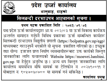 | 2 | Provincial Energy Office, Bhalubang Dang | Supply, Installation & Construction of 33 KV HT & 0.4Kv LT Line with Transformer & Overhead line accessories, Okharakharka Githaaola Dhapkhaola, Bhumikastan, 1, Dhakabang-Arghakhanchi | 15/04/2026 | PPMO | 15/05/2026 | Click Here | |