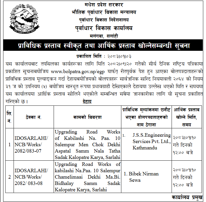 | 10 | Urban Development And Building Office, Kailali | Shree Shiv Pra bi Kailari 05 Shiv Tole Dhekhi Pipal Chautra Hudai Jana Kalyan Ma Bi Pabera samma Ko Sadak Starunnati,Kailari 05,Laxman Chaudhary Ko Ghar Dhekhi Bhaghu Das Chaudhary Ko Ghar Hudai Hulaki Sadak Samma Sadak Nirman Kailari Ga.Pa 05,Hasuliya Bajar Ma Dhal Nikash,Kailari ga.Pa 01,Kailali | 15/04/2026 | PPMO | 15/05/2026 | Click Here | |