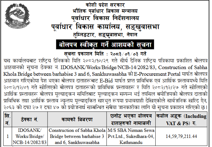प्रदेश १ मा प्रकाशित निर्माण सम्बन्धी बोलपत्र तथा आशयका सुचनाहरु
