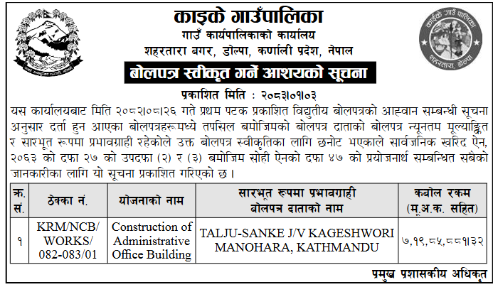 | 29 | Urban Development And Building Office, Kailali | Bhajani Na.Pa 02 No. Ward Karalaya Bhawan ko Tala Thap,Bhajani Na Pa.2,Kada Nadhi Sichai Samati Ko Adhuro Bhawan Nirman Bhajani Na.Pa 2, 3 No. Ward Karalaya Bhawan Tala Thap Bhajani Na.Pa 3,Kailali | 15/04/2026 | PPMO | 15/05/2026 | Click Here | |
