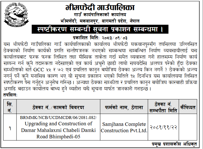 | 54 | Mechinagar Municipality Jhapa | Ghatte syangletar sadak marmat,Mechinagar-03 | 15/04/2026 | PPMO | 30/04/2026 | Click Here | |