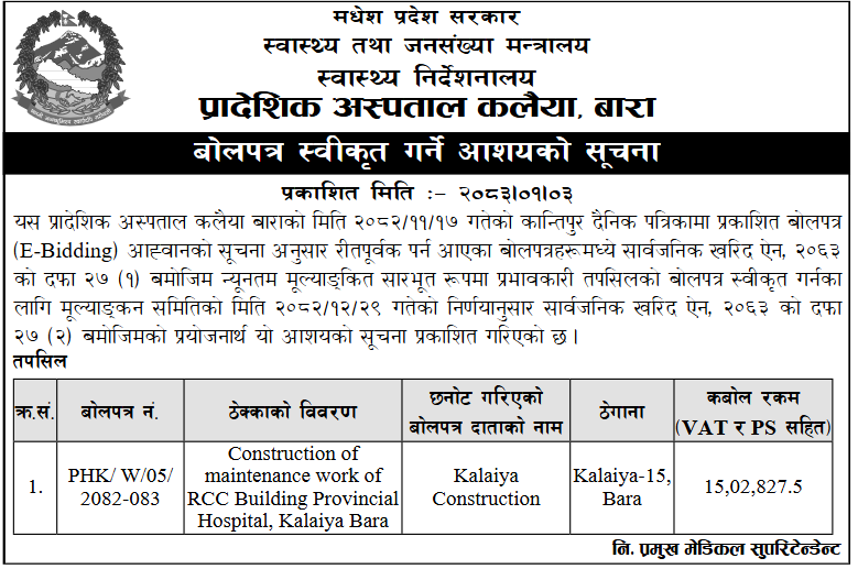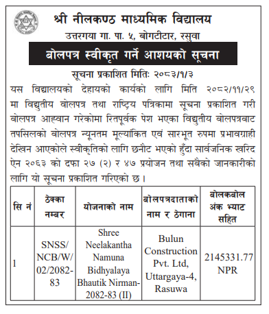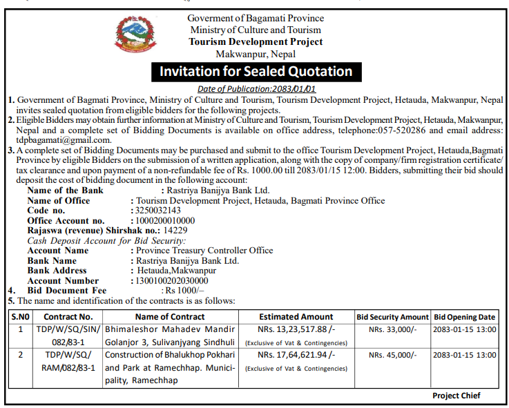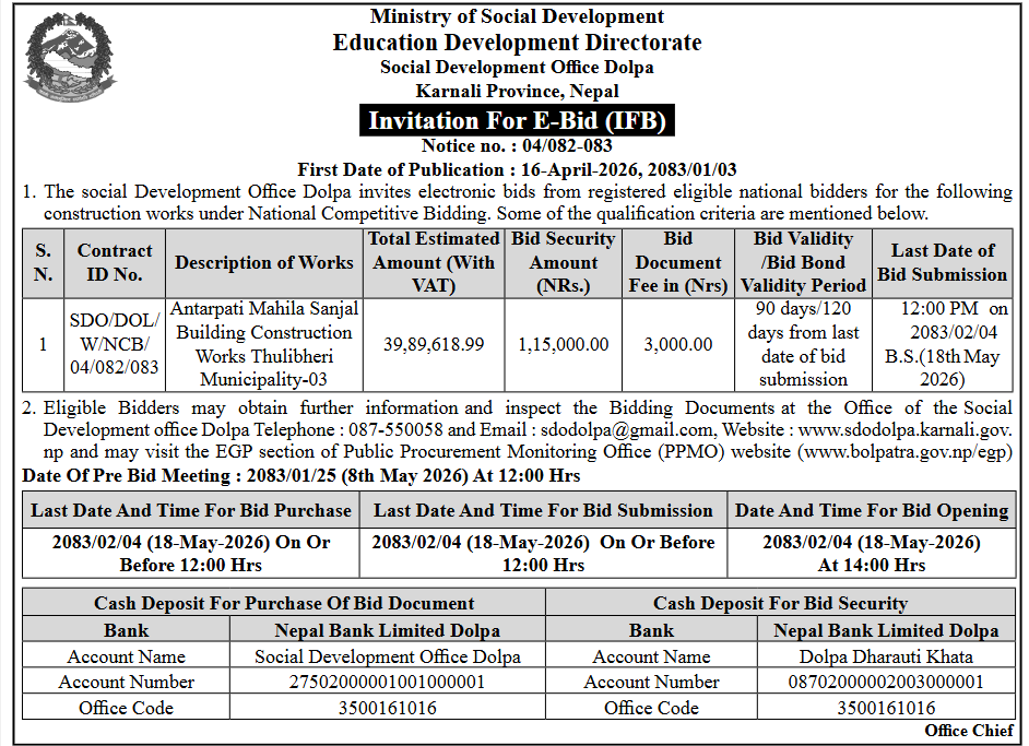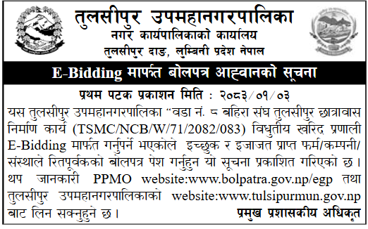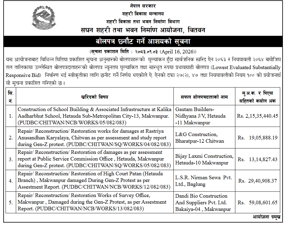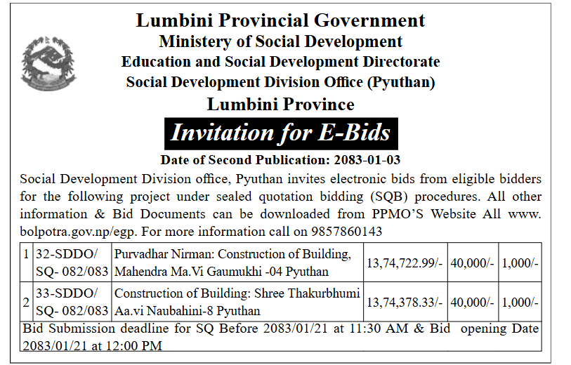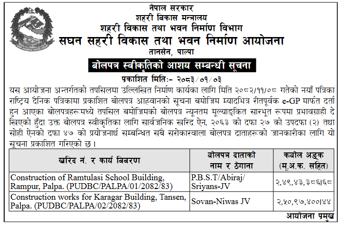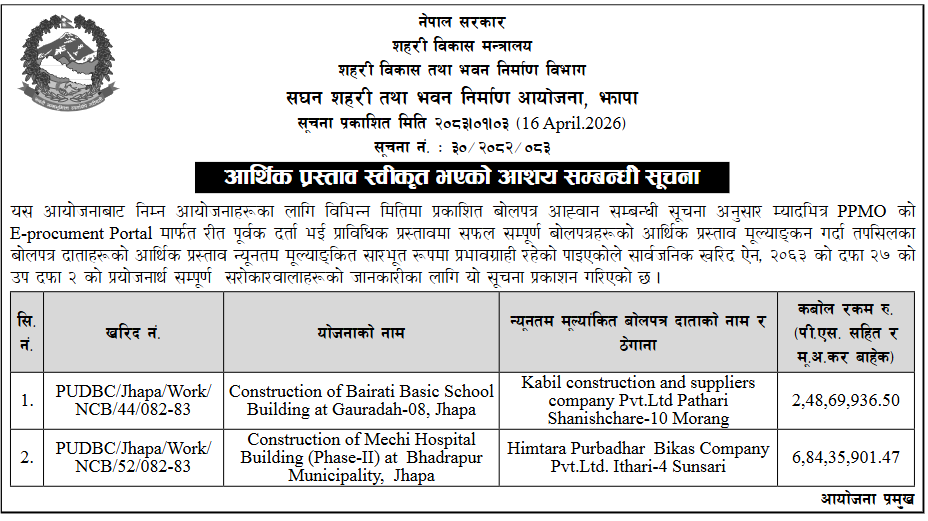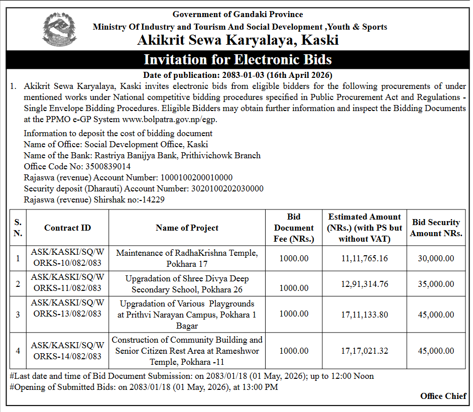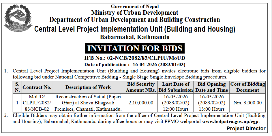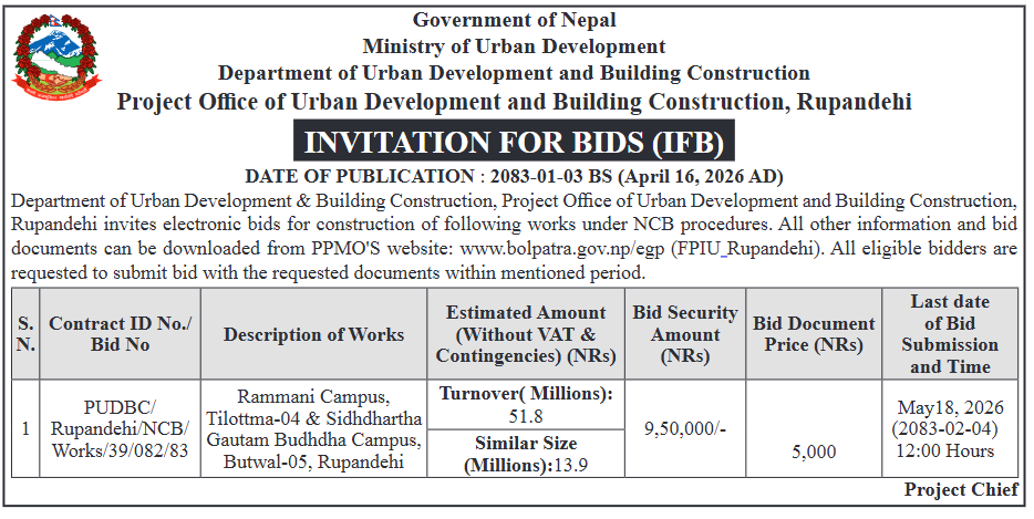 | 27 | Urban Development And Building Office, Kailali | Construction Of Shidh Tole Dharmashala ,Bhi.Na.Paa-18, Kanchanpur. | 15/04/2026 | PPMO | 15/05/2026 | Click Here | |