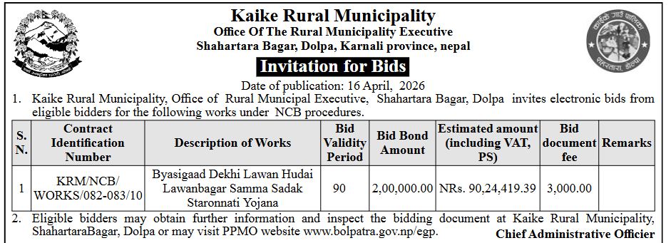 | 4 | Infrastructure Development Office , Kailali | Construction of Jhaprenisain to Ward Office Road ,Chure Ga.Pa- 04 , Kalali | 15/04/2026 | PPMO | 15/05/2026 | Click Here | |
