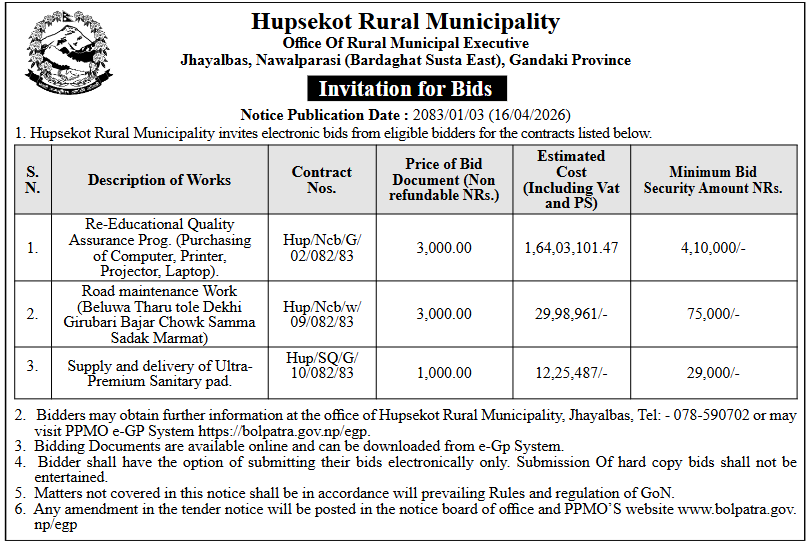 | 70 | Road Infrastructure Development Office, Arghakhanchi | Janai Pokhara Karlung Kurakapokhara Haranchanidada hudai Tilkepokhara Motorbato Sandhikharka-05, Arghakhanchi. | 15/04/2026 | PPMO | 30/04/2026 | Click Here | |