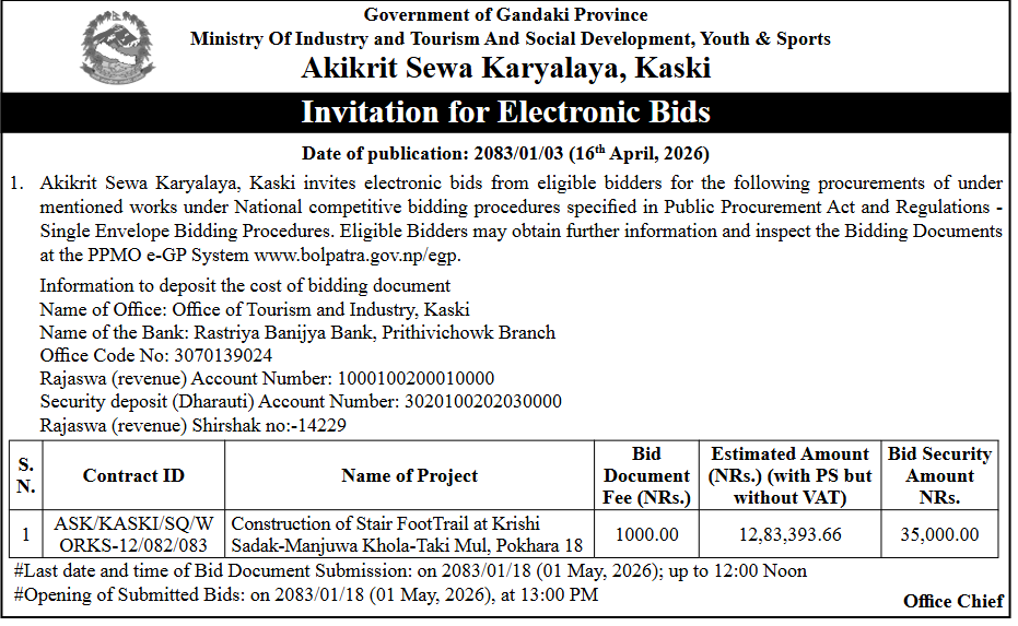 | 42 | Machhapuchhre Rural Municipality, Kaski | Construction of Hemjakot-Dhital-Dhampus-Mardi Himal Trail | 15/04/2026 | PPMO | 14/05/2026 | Click Here | |