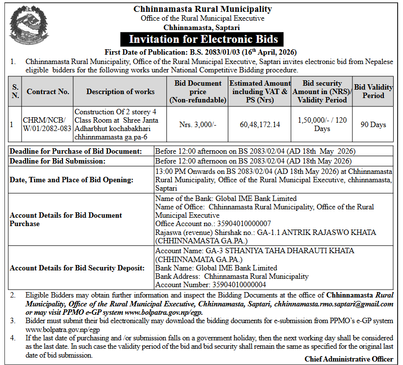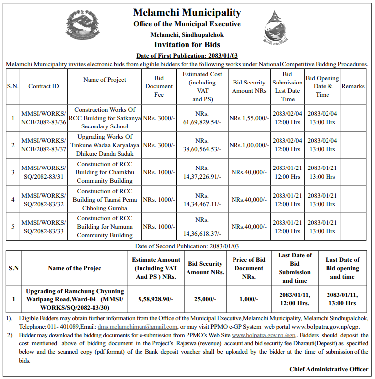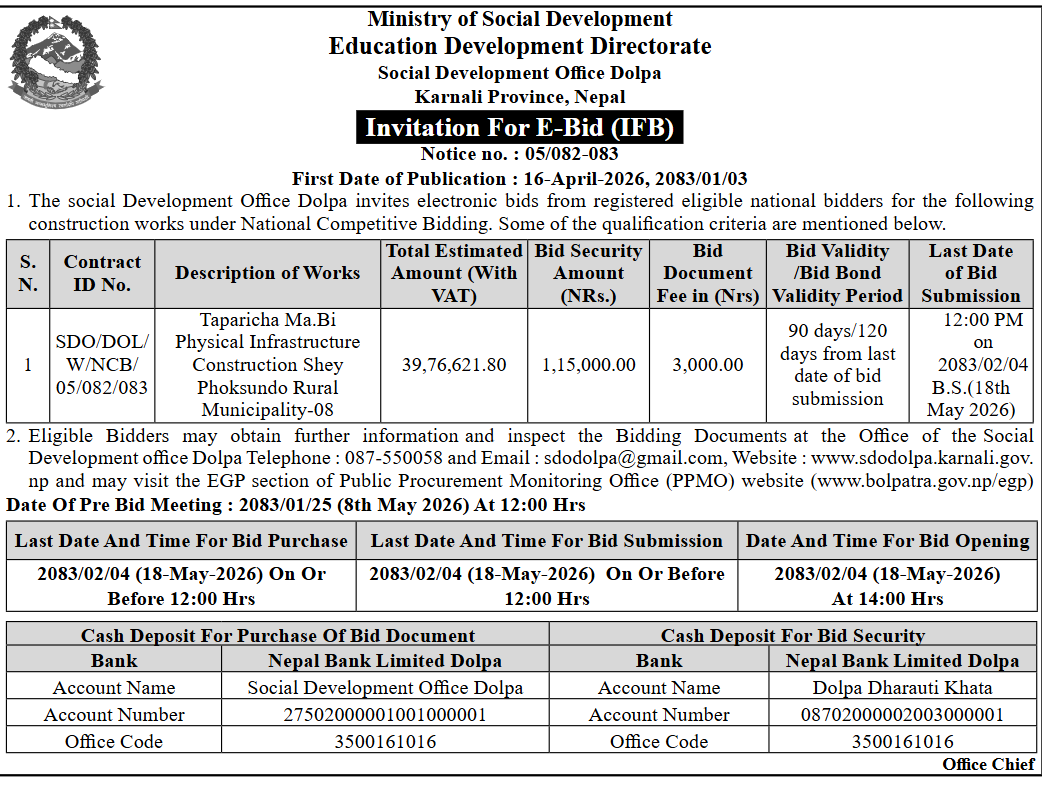 | 8 | Sunapati Rural Municipality, Ramechhap | Construction Sunapati Brihat Lift Khanepani Neiman Yojana, Sunapati-05 | 15/04/2026 | PPMO | 15/05/2026 | Click Here | |