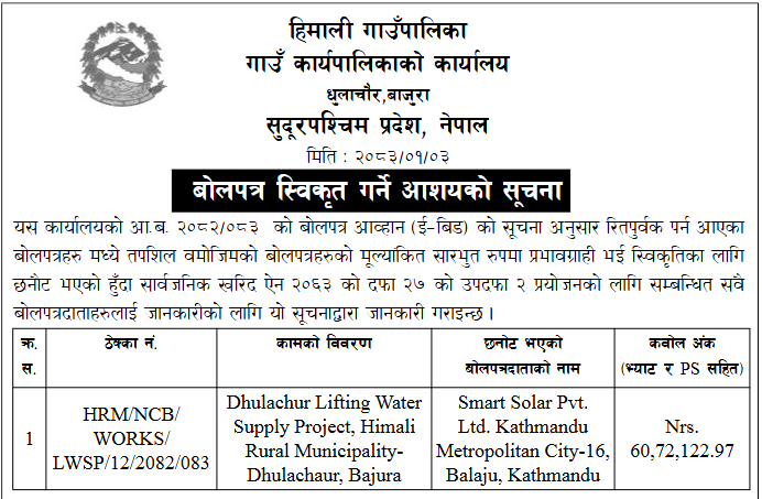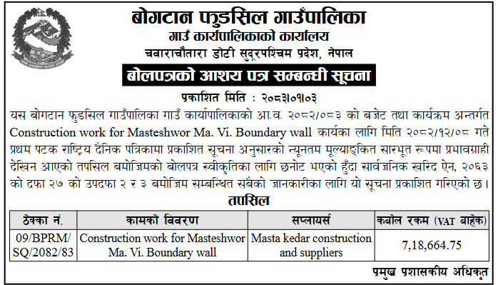 | 62 | Purbichauki Rural Municipality, Doti | Construction of Sajendrshwor Deuta ko Mul Ghar Nirman purbichauki RM 01 Doti, | 15/04/2026 | PPMO | 30/04/2026 | Click Here | |