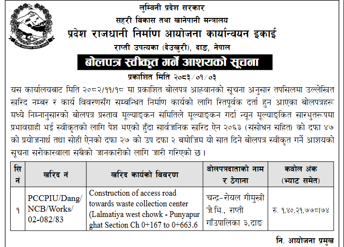| 82 | Urban Development And Building Office, Kailali | Construction Of Black Topped Road Road From Jimuwa Kanchanpur Sangam Tole's Mrs Sarasawati Devi Karki Home To Dambaar Bist Home, Bhi.Na.Pa-10, Kanchanpur.. | 15/04/2026 | PPMO | 30/04/2026 | Click Here | |