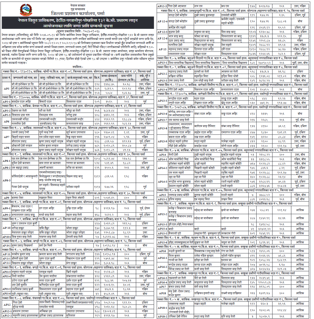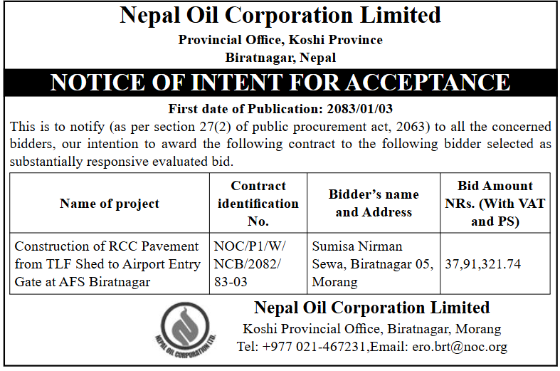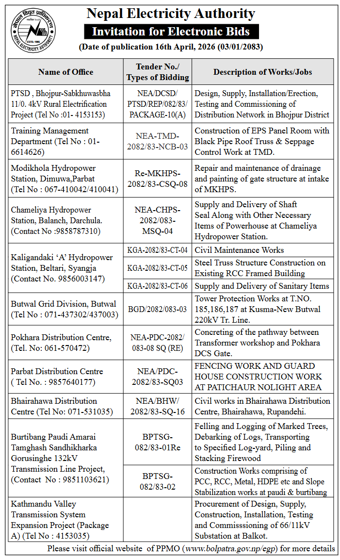 | 59 | NEA, Bardaghat Distribution Center | Construnction Works of 11 Kv HT Line From Gandak S/S to Pratappur Bridge & Transformer Installation at Different Places of Bardaghat DCS | 15/04/2026 | PPMO | 30/04/2026 | Click Here | |