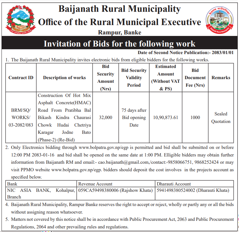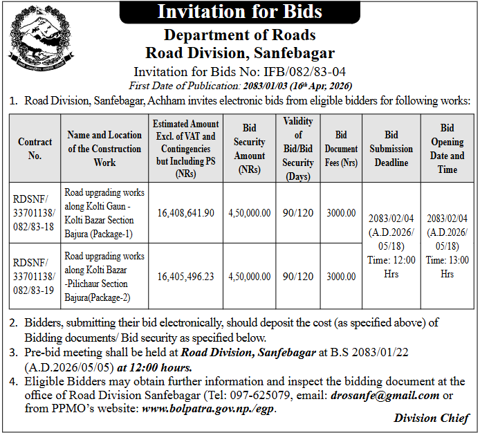 | 63 | Purbichauki Rural Municipality, Doti | Construction and maintance of Sajghat-Gairagaun Road Purbichauki Rm 03 and Dhanukada-Simpata-Batalagaun Road Purbichauki Rm 05 | 15/04/2026 | PPMO | 30/04/2026 | Click Here | |