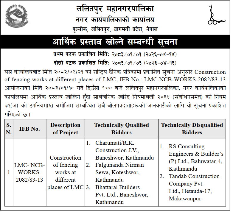 | 84 | Urban Development And Building Office, Kailali | Construction Of Ganda Nala Of Rcc Wall At Vijay Tole,Bhi Na paa-13, Kanchanpur | 15/04/2026 | PPMO | 30/04/2026 | Click Here | |