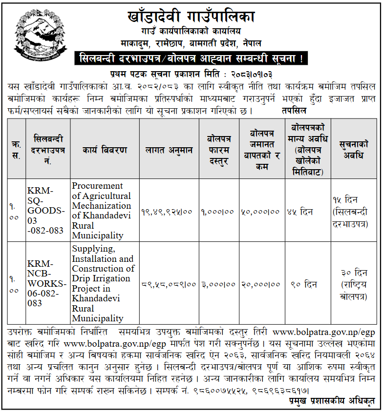 | 31 | Water Resources and Irrigation Development Division Office Baglung | Construction of Irrigation Canal, Pipeline Works, and Associated Structures at Badhkhola Tallokhada ISP (Jaimini-1), Timurkhola Chasaya Kulo ISP (Jaimini-1), Biraune ISP (Jaimini-2), Rotapani ISP (Jaimini-7), and Khariko Bot ISP (Jaimini-9), Baglung | 15/04/2026 | PPMO | 15/05/2026 | Click Here | |