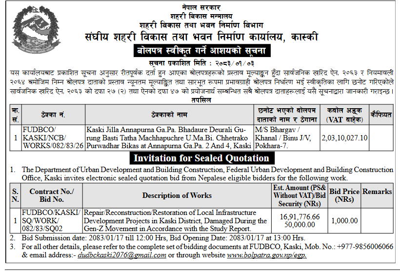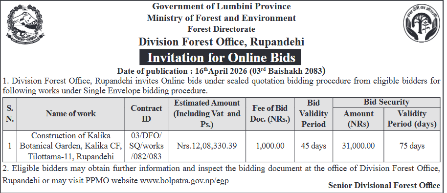 | 83 | Urban Development And Building Office, Kailali | pokhara Park Ma Eco Park Nirman Tatha Marmat Dhangadhi 07,Kailali | 15/04/2026 | PPMO | 30/04/2026 | Click Here | |