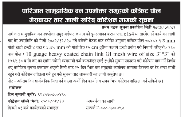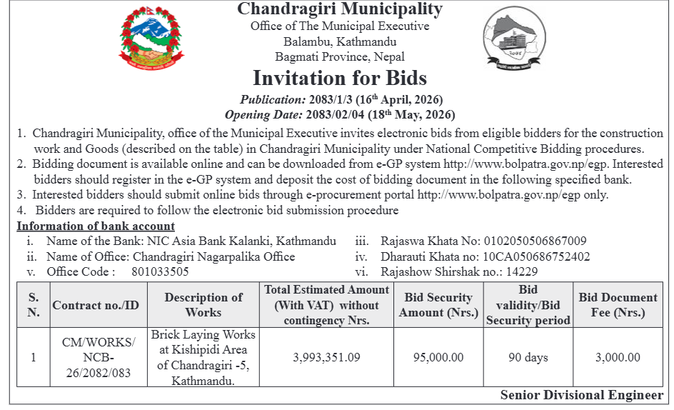 | 9 | Soil and Watershed Management Office, Makwanpur | Construction Of Gabion Embankment Work For Kayarkhola Jaladhar tatha Tatiya kshetra Sanrakshan,Kalika-8,Chitwan | 15/04/2026 | PPMO | 15/05/2026 | Click Here | |