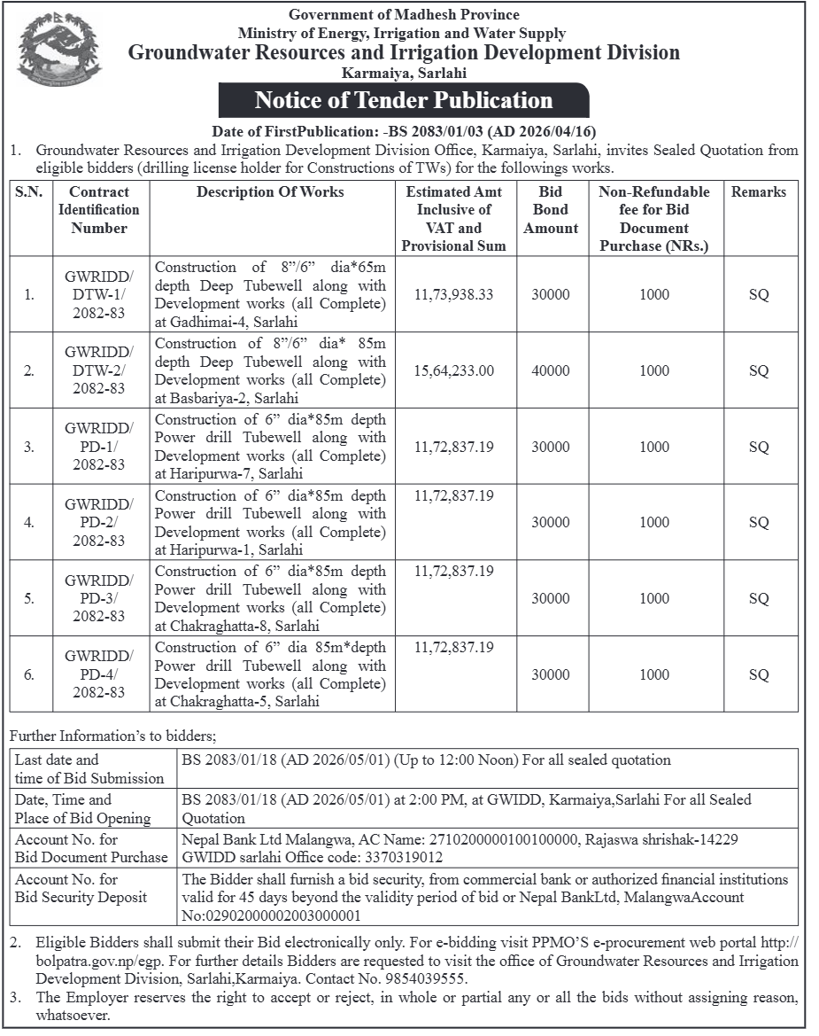 | 33 | Water Resources and Irrigation Development Division Office Baglung | Construction of Irrigation Canal,Pipeline Works, River Training Works and Other Associated Structures at Piplekhet Canal Scheme, Maidale Canal Scheme, Upallopadhera First & Second Scheme, Gairibari First & Second Scheme, Kalleri Kusule Scheme, Kallerikhet Muhan Scheme, Balghas Upallokulo Scheme, Bisauna Gargarey Scheme in Badigad Ga.Pa-9 & Bhimgath First Microhydro Dikshekholti ISP in Badigad Ga.Pa-7, Baglung | 15/04/2026 | PPMO | 15/05/2026 | Click Here | |