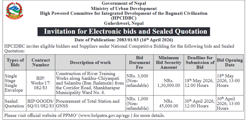 | 3 | Hetauda Sub-Metropolitan City | Extraction of River Bed Materials (Stone, Aggregate, Sand, Gravel etc.) (Works for Internal Revenue Collection) | 15/04/2026 | PPMO | 15/05/2026 | Click Here | |