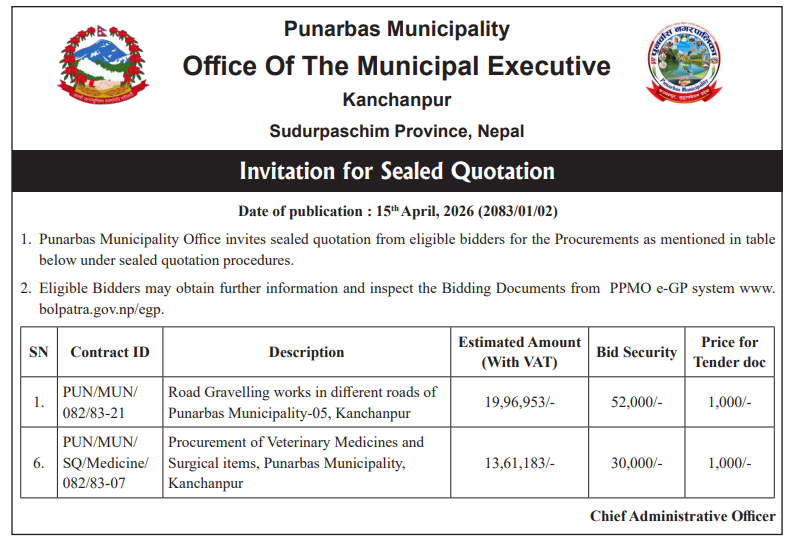 | 100 | Punarbas Municipality Office | Procurement of Veterinary Medicines and Surgical items, Punarbas Municipality, Kanchanpur | 15/04/2026 | PPMO | 30/04/2026 | Click Here | |