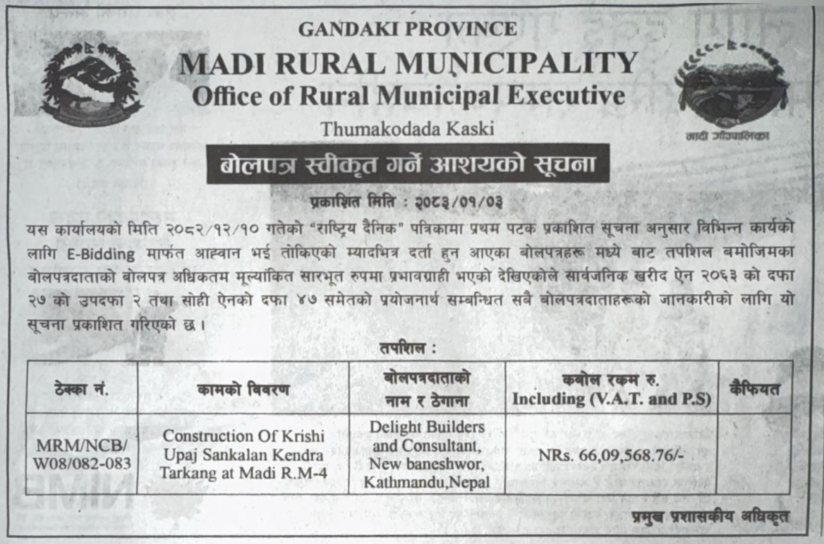 प्रदेश ४ मा प्रकाशित निर्माण सम्बन्धी बोलपत्र तथा आशयका सुचनाहरु