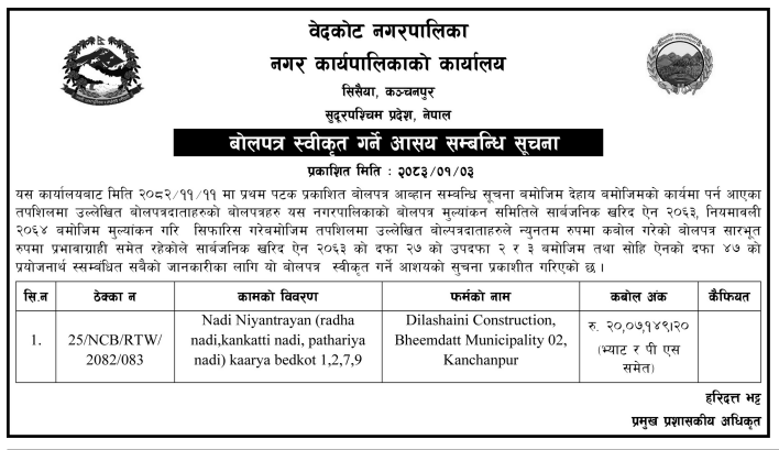 प्रदेश ७ मा प्रकाशित निर्माण सम्बन्धी बोलपत्र तथा आशयका सुचनाहरु