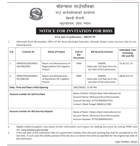 | 224 | Shuklaphanta Municipality, Kanchanpur | Collection of Internal Revenue from Extraction of Construction Materials from Gaudi Khola ward no 8 in Shuklaphanta Municipality | 14/11/2025 | PPMO | 01/12/2025 | Click Here | |