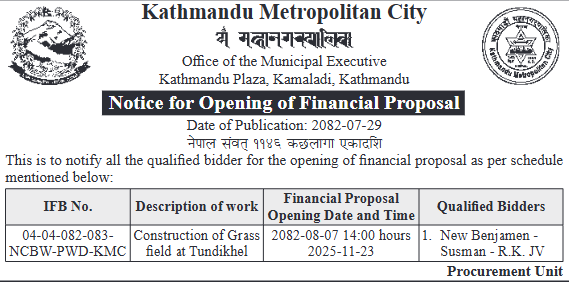 | 1 | Mahakulung Rural Municipality | Mahakulung Ringroad Upgradation Works at Mahakulung Rural Municipality, Bung, Solukhumbu. | 14/11/2025 | PPMO | 16/12/2025 | Click Here | |