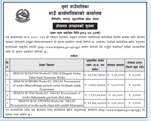 | 2 | Budhinanda Municipality, Bajura | Tadi Godhakot Motedhunga Chamlaya Hudai Wada No. 4 Ko Wada Karyalaya Jodne Sadak | 14/11/2025 | PPMO | 15/12/2025 | Click Here | |