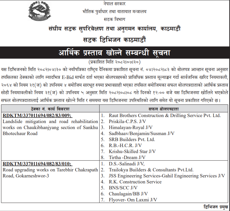 | 215 | 405 Division Road Office Surkhet | Road Improvement Work of Surkhet-Dailekh Road-RDSKT/33701138-4/082/83-016 | 14/11/2025 | PPMO | 14/12/2025 | Click Here | |