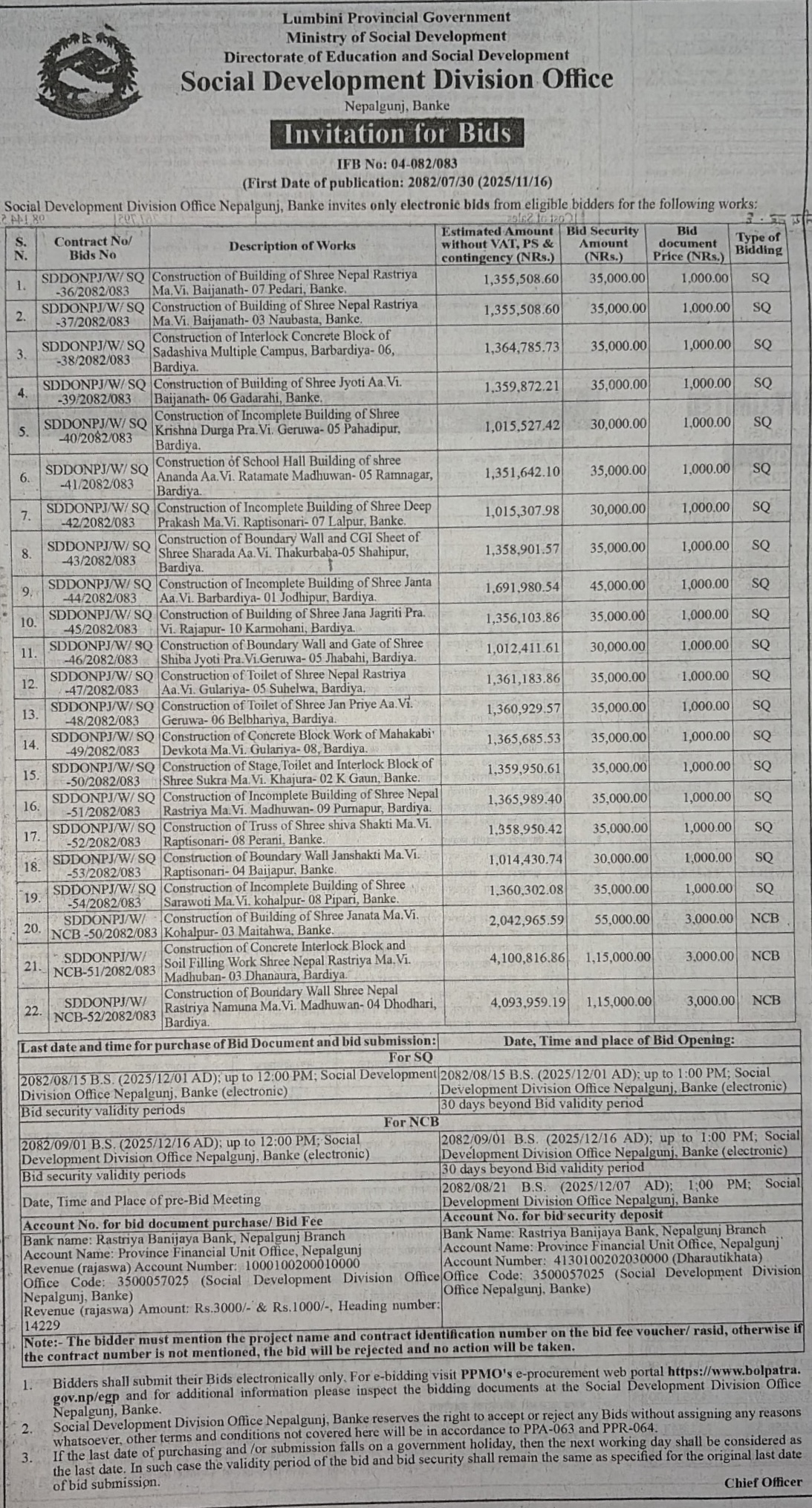 | 206 | Social Development Office, Kailali | Construction of 2 room Building in Janata aa vi , Chure -02, Kailali | 14/11/2025 | PPMO | 14/12/2025 | Click Here | |