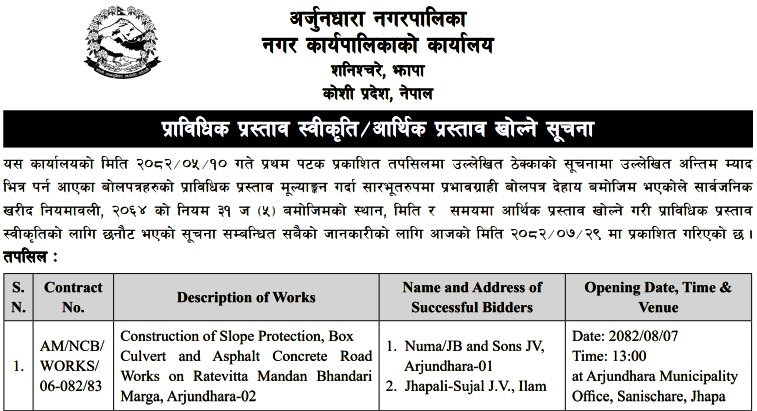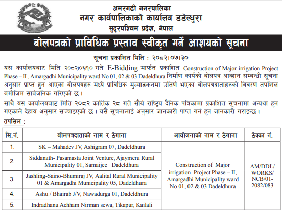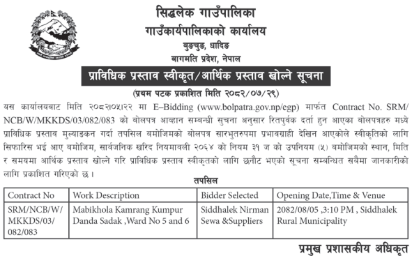 | 24 | IDOSYANGJA | Phedi Khoriya Pisekharka Gaulibhanjyang Sadak Staronnati Kaligandaki 07, Syangja | 14/11/2025 | PPMO | 15/12/2025 | Click Here | |