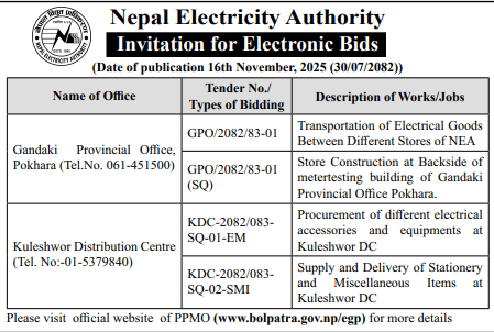 | 270 | NEA, Pokhara Distribution Center | Supply and delivery of copper strips and wires at pokhara Dcs,Pokhara malepatan | 14/11/2025 | PPMO | 30/11/2025 | Click Here | |